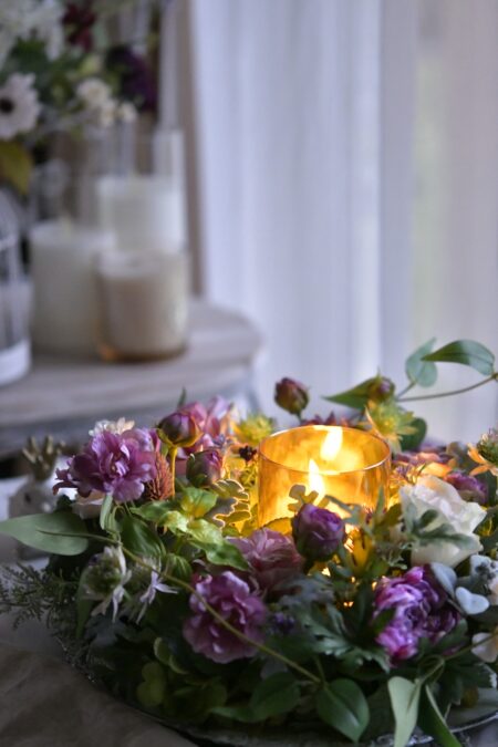 リースの真ん中にキャンドルホルダーをあしらい、灯りをともせばふんわりと温かな空気に包まれます。