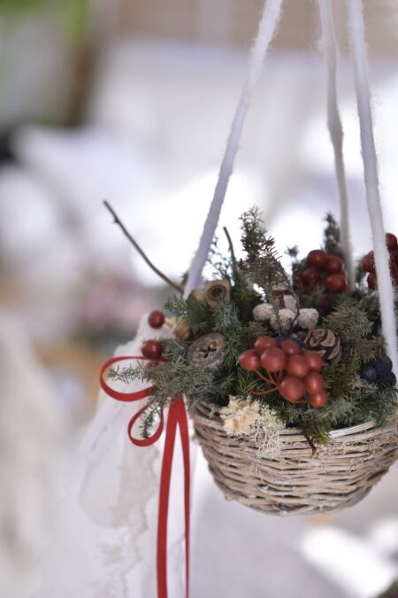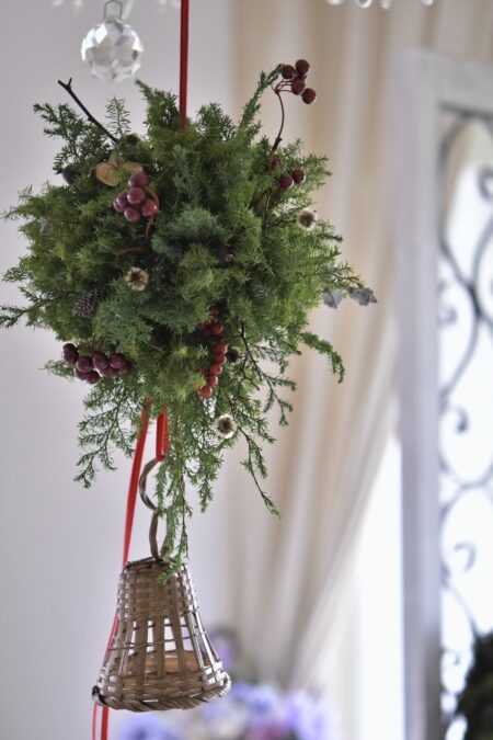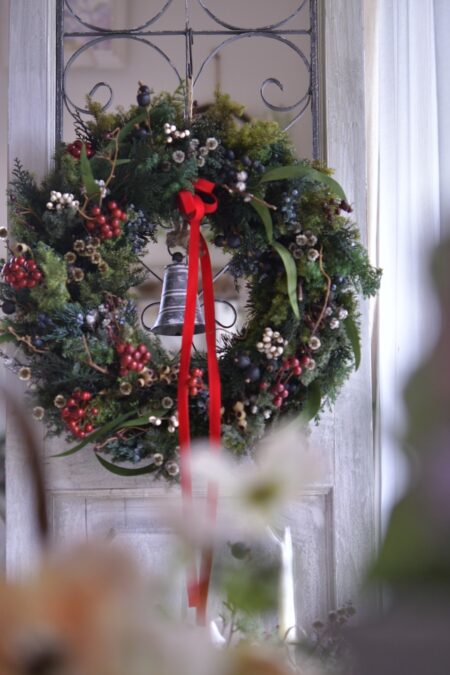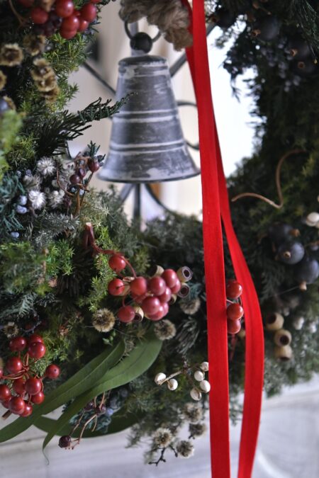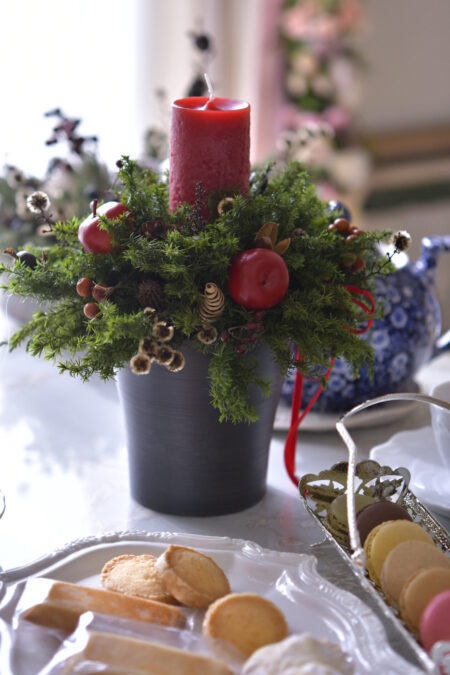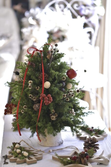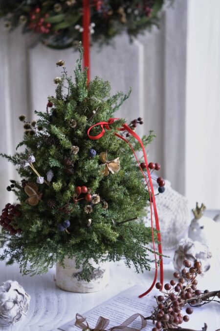 赤い実モノや赤いリボンを入れると一気にクリスマスらしくなりますね。