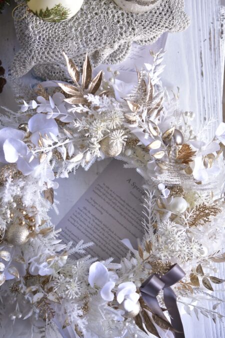 さて、王道のグリーンのリースもいいですが、今年はホワイトクリスマスリースも素敵です。