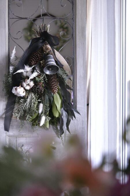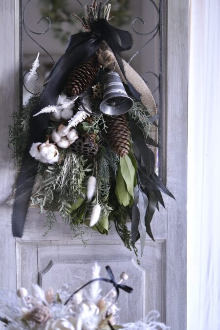 そこに、針葉樹の瑞々しさやユーカリの落ち着いたグリーンを重ねて、立体感のあるスワッグ。